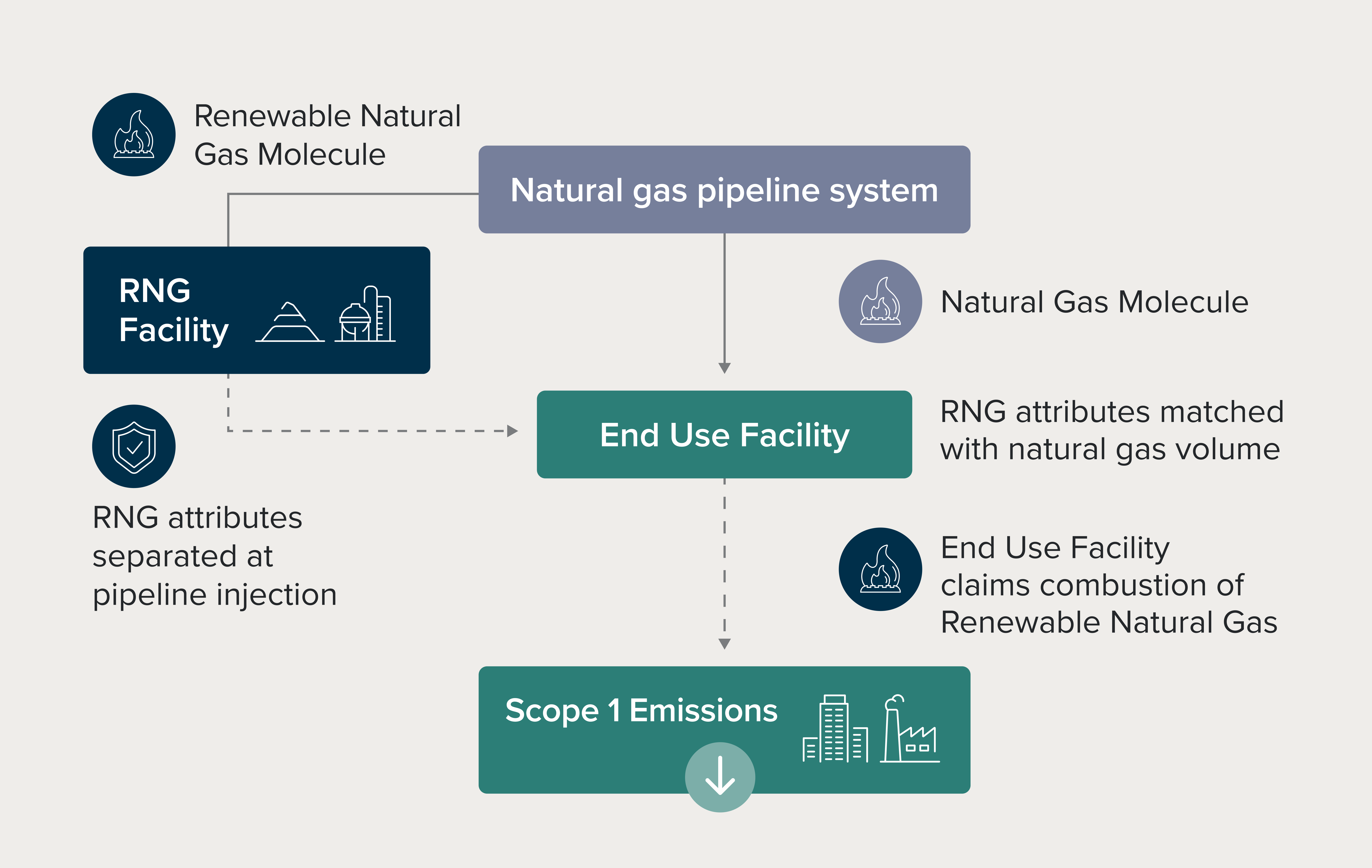 When RNG is injected into gas pipelines, the environmental attribute is separated from the physical gas and tracked as an RTC. The set up is similar to how the environmental attributes of renewable electricity are tracked and delivered through the use of renewable energy certificates (RECs).